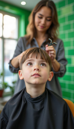 Young boy getting a haircut in a vibrant salon