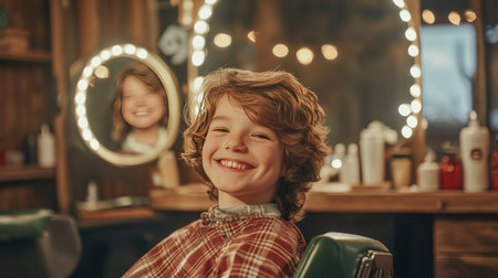 A cheerful boy enjoys his time at the barber shop, smiling happily in a warm and inviting environment. The glowing mirror creates a delightful atmosphere.