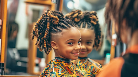 A joyful girl showcases her stylish hair in a salon setting, smiling confidently as she admires her reflection in the mirror, radiating happiness and creativity.