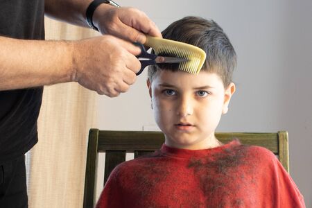 Stay at home situation: Father cutting hair of son at home during 2020 Covid-19 pandemic crisis