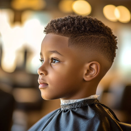 A young African American boy sits in profile at a barber shop, focused and calm, ready for his haircut while surrounded by the buzzing atmosphere of grooming
