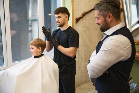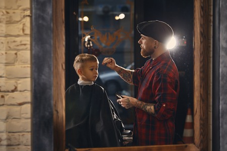 Skilled barber looking at the little boy client with new hairdress