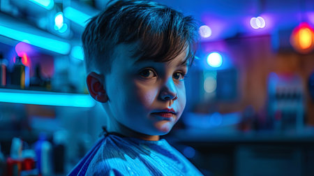 Children's portrait with a dark blue haircut in a neon barbershop, illuminated by luminous lights.