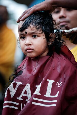 Close-up of baby boy devotee getting tonsured or head shaving ritual in Thaipusam Festival.