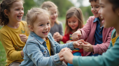 Group of children laughing and playing joyfully in a park on a sunny day, Fostering a sense of belonging and inclusion