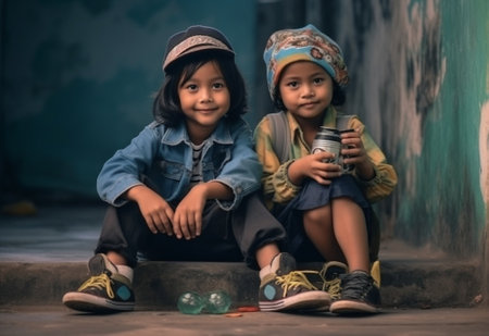 Joyful asian children playing in colorful alleyway.