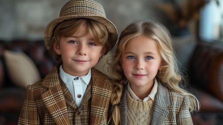 portrait of a cute smiling couple of children, in respectable suits, background
