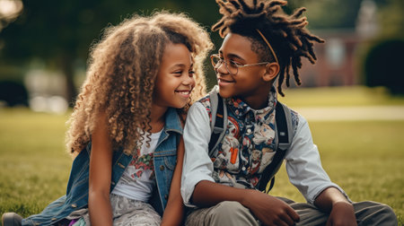 African American boy and girl hug happily amidst the beauty of a park, radiating positivity.
