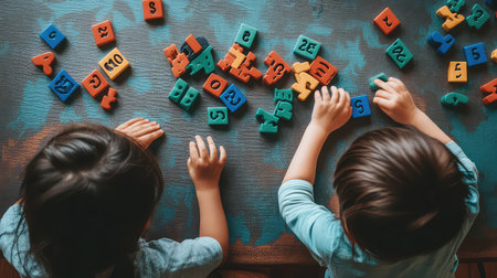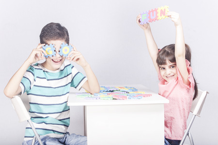 At home. Curly boy and dark-haired girl sitting at round table, playing with alphabet letters