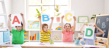 Close-up of children sitting at the table together with cards and learning English alphabet