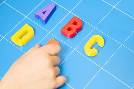 A small child plays with colored letters and tries to put them into words. Preschool education concept.