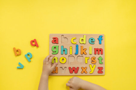 Childs hand arranging colorful alphabet puzzle on wooden board