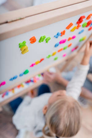 Girl learning using magnetic letters and numbers. Education School Concept