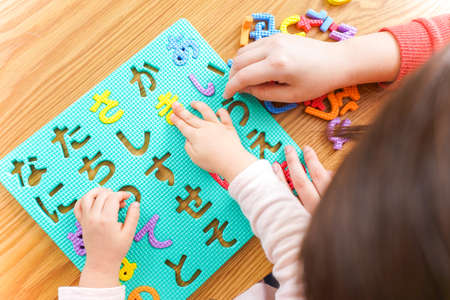 Two adorable young Asian girls are enjoying studying English alphabet flashcards with a private teacher at home. preschool, kindergarten, elementary school