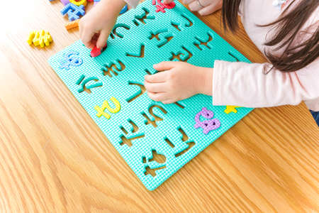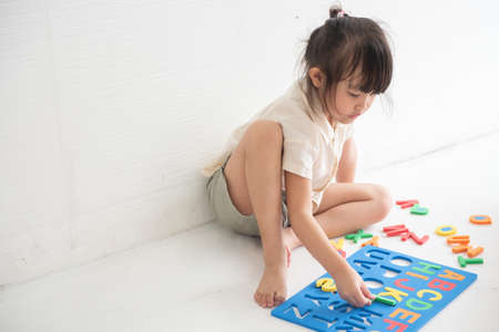 Cute little Asian girl playing and learning English characters