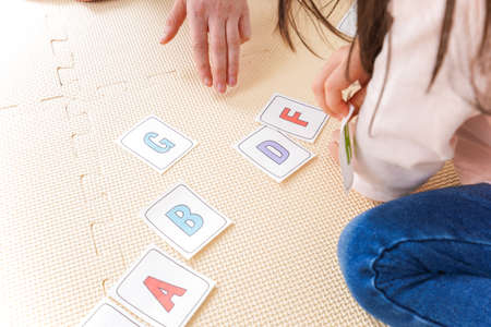 Close-up of little girl sitting at the table and learning cards with English letters during a lesson