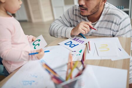 Close up portrait of stay at home dad teaching alphabet to cute little daughter at home, copy space