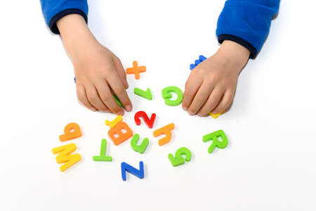 Child hands playing with colorful alphabet letters on white background
