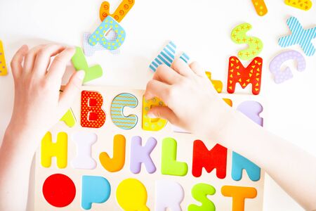 Child's hands playing with colored letters. Education concept