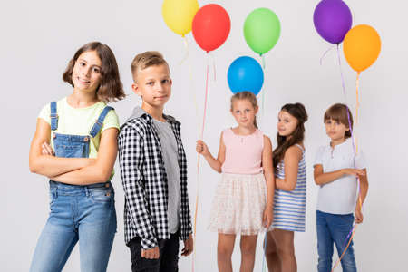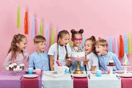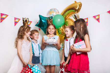 Happy beautiful cute kids smile at the holiday party with balloons and confetti together at the table in the white room