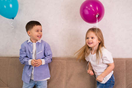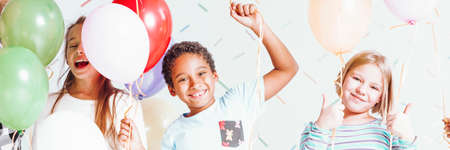 Balloons and confetti. Children on celebrating birthday party indoors have fun together
