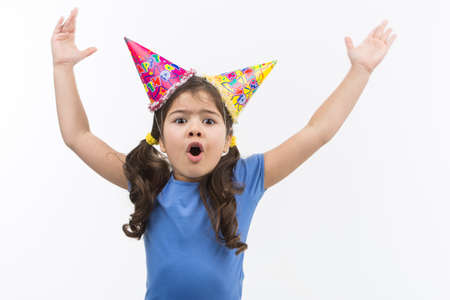 little girl throwing hands up and shouting. girl having party and dancing guests
