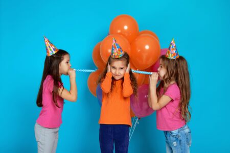 happy funny children in birthday hat with bright colorful air balloons blowing party horn isolated over blue background. girl friends having fun together
