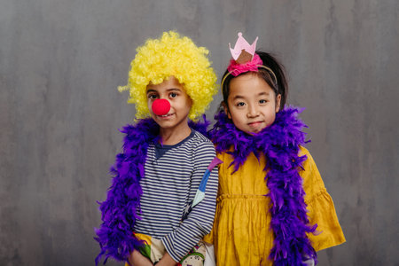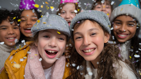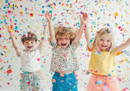 Multicultural group of happy children celebrating together indoors with balloons and confetti during a joyful party atmosphere in the afternoon