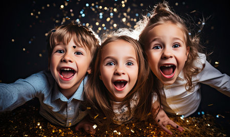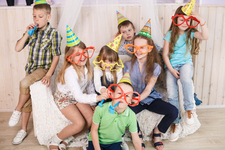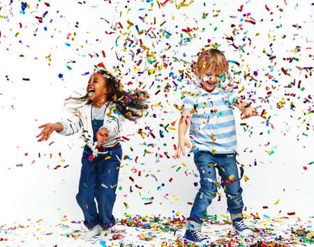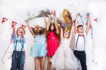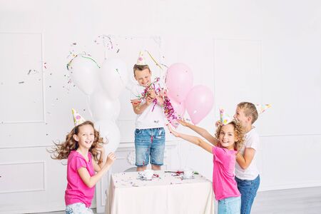 Happy beautiful cute kids smile at the holiday party with confetti together in the white room