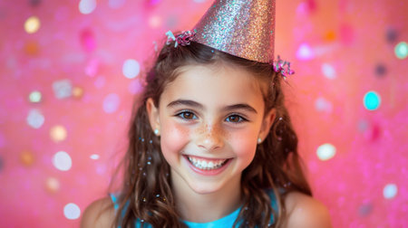Joyful child wearing a golden party hat, laughing amidst falling golden confetti against a vibrant teal background