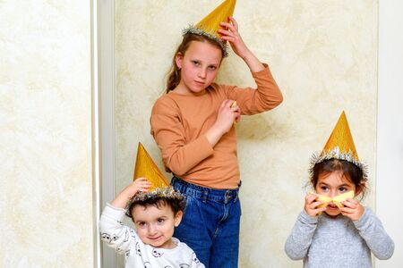 Portrait of three children in a party hat having fun and eating cookies on the Purim or birthday party. Selective focus of teenager young girl.
