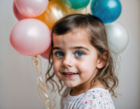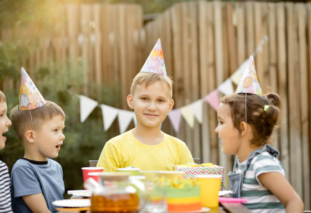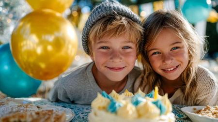 Happy children smiling at festive birthday party with balloons and cake, symbolizing joy, friendship, and childhood.