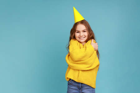 Little girl in party cone, embracing herself, celebrating her birthday, looking smiling at camera, wearing yellow casual style sweater. Indoor studio shot isolated on blue background.