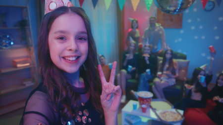 A girl in a party hat takes a selfie with herself and with friends in the background. Happy girl shows victory sign. Home party, in a beautifully decorated room with a mirror ball.
