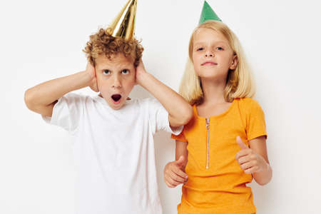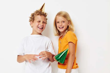 picture of positive boy and girl with caps on his head holiday entertainment light background