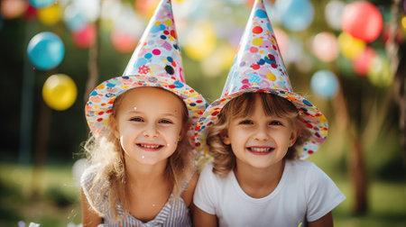 Two children celebrate a joyful birthday gathering, adorned with playful party hats, chatting enthusiastically amid a colorful atmosphere filled with balloons and excitement.