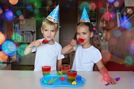 Happy sister and brother having fun at birthday party at home, glass with traffic light colored jelly, holiday and celebration concept. Indoor portrait