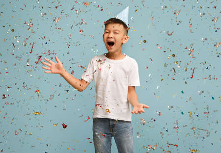 Birthday Party. Happy Asian Boy Wearing B-Day Hat Standing Under Falling Confetti