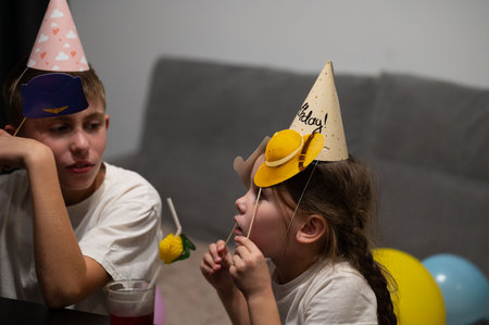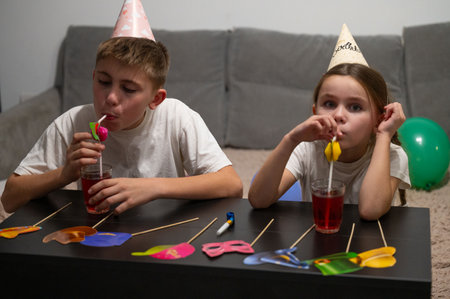 Two children celebrate with refreshing drinks and party hats, surrounded by festive decorations on the table, creating a joyful atmosphere in their comfortable living room.