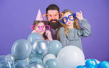 Best dad ever. Friendly family wear funny party accessories. Fathers day. Daughters need father actively interested in life. Birthday party. Father with two daughters having fun. Fatherhood concept