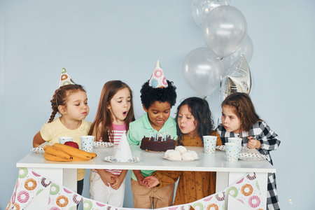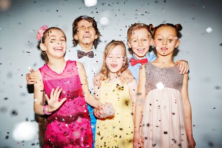 Group of beautiful kids throwing colorful confetti and looking happy on birthday party