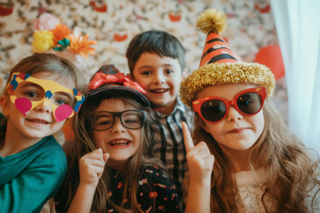 Four cheerful children wearing funny accessories and posing for a photo at a birthday party