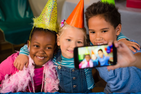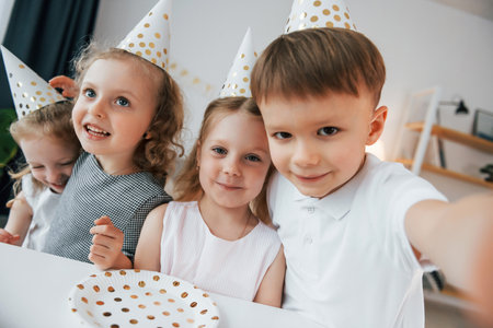 Making selfie. Celebrating brithday. Group of children is together at home at daytime.