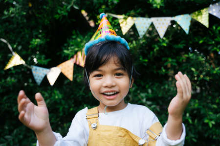 Portrait of cheerful asian black hair kid wear party hat for birthday celebration at yard.