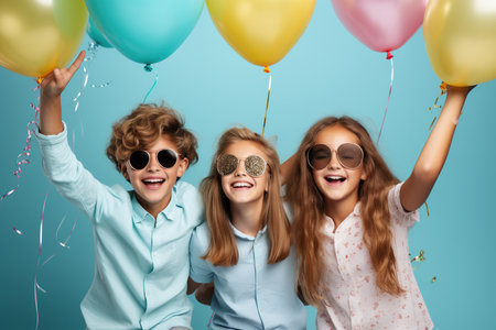 Happy kids celebrate birthday party with baloons and confetti over light background