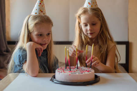little girls, sisters, twins are happy to decorate birthday cake with candles homemade holiday hat. child's birthday, celebration, indoor party during sickness, quarantine, isolation