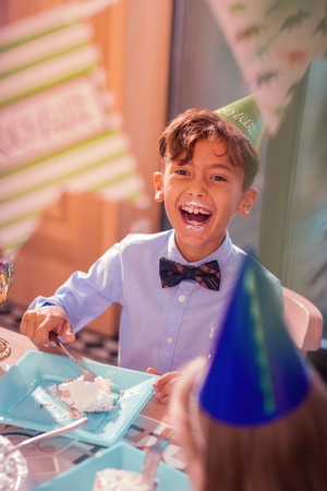 Laughing while eating. Emotional birthday boy wearing party hat and laughing with his mouth open while eating the cake