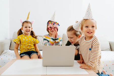 Four little kids having online birthday party on a quarantine at home. They are celebrating in front of laptop, wearing party cone hats.