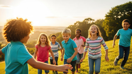 A group of diverse children are running and laughing in an outdoor setting. The scene is illuminated by natural sunlight, creating a warm, inviting atmosphere. The composition includes vibrant colors and a sense of movement. Suitable for illustrating concepts of childhood, happiness, and outdoor activities in various commercial contexts.