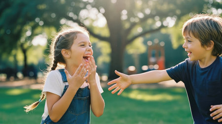 Two children are captured in a moment of pure joy, laughing heartily in an outdoor setting. The image showcases warm sunlight and a blurred background, creating a cheerful atmosphere. The composition and lighting are suitable for a variety of uses, including marketing, editorial content, and educational materials.